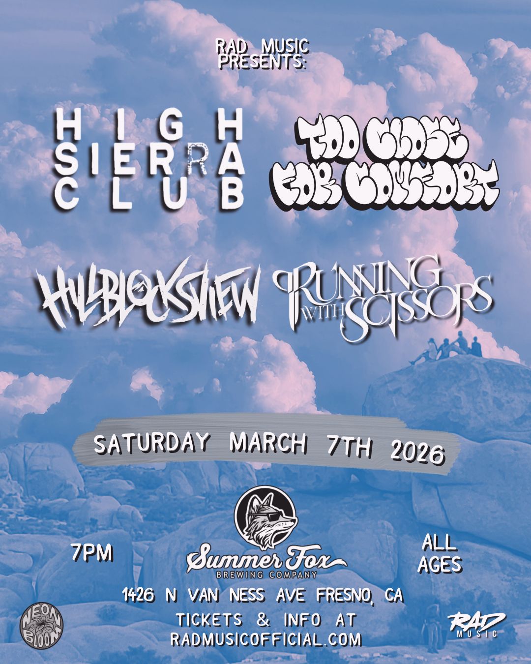 Spring is looking GOOD for 2026….for music at least. Let’s start early THIS SATURDAY! We’ve got desert emo bands High Sierra Club(Vegas) and Too Close For Comfort(Reno) coming to Summer Fox Tower! Get tix now to see them with Hillblocksview and Running With Scissors! Get tix HERE
