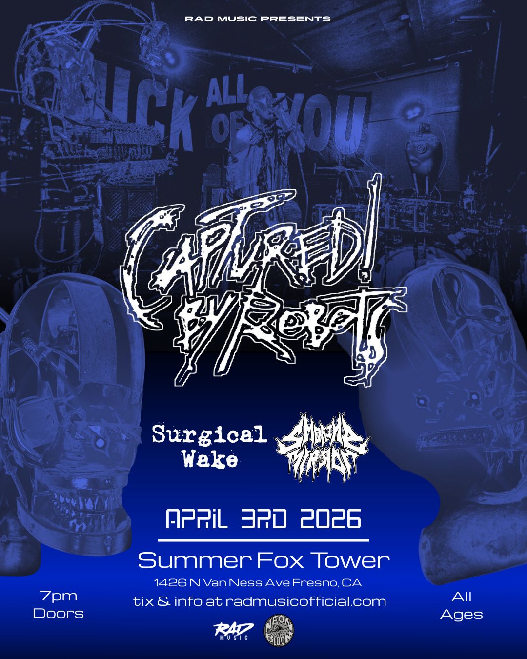 THE MOST BRUTAL ROBOT BAND EVER, CAPTURED! BY ROBOTS, ARE HITTING SUMMER FOX TOWER APRIL 3RD!! Yes, two “members” of the band are literally robots. I’m not joking. Get tix now to see them with Surgical Wake and Smoking Mirror!